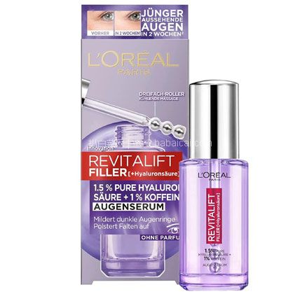 L'Oreal Paris 欧莱雅 复颜玻尿酸水光眼部精华液 20mL,含有1.5%透明质酸,可增强皮肤的保湿性,1%咖啡因,可以重新激活皮肤,帮助减少黑眼圈和浮肿,独特的三重配方滚轮涂抹器带有三个冷却的不锈钢球,可弯曲提供全面的眼部轮廓按摩,让眼睛看起来神清气爽、休息良好。