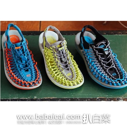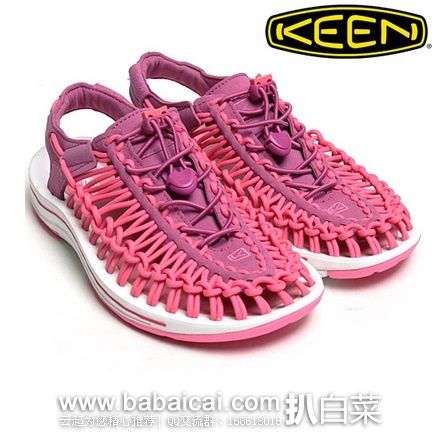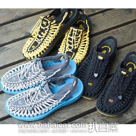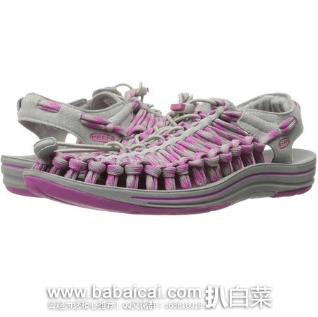 科恩Keen是世界三大户外凉鞋品牌,Keen Uneek系列户外编织凉鞋,在各媒体评出的2015年最酷的凉鞋中均排名第一。这款科恩KEEN Women's UNEEK 8MM Sandal女士编织户外凉鞋,看上去很酷,不过功能性远大于其时髦程度,这款鞋子的原型来自罗马凉鞋,加上编织草鞋的灵感,整个鞋面是两babaicai.com根尼龙绳穿起来的,能够轻松移动适应不同的脚形状。鞋底是橡胶大底,中底是发泡橡胶PU,让鞋底在耐磨与重量之间达到平衡。