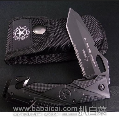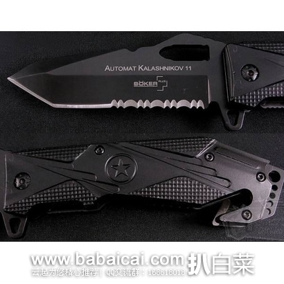 BOKER是德国著名刀具制造厂商,位于历史制刀名城索林根,始创于1829年,标志是一棵栗子树,品牌就叫TREE BRAND(树牌)。这款Böker Plus AK-11 博克战术折叠刀,属于博克的卡拉什尼科夫系列,货号01KAL11,定位上也是一把EDC刀具,适合随babaicai.com身携带。刀身总长度20.5cm,刃长8.5cm,刀刃材质为440c不锈钢,刀柄材质为结构化铝材握持舒适,刀身总重量183g,带线索更安全,可单手开启,刀刃后部有锯齿方便进行切割。