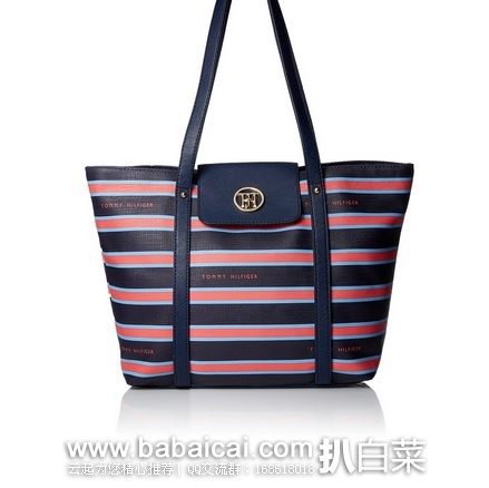 Tommy Hilfiger Hayden Stripe Tote Top Handle Bag 汤米希尔费格 女士单肩包,采用帆布涂层材质,看起来类似十字纹皮革的质感,底部为耐磨的babaicai.com合成革,经典托特包的款型,条纹造型时尚活力。主袋为磁性按扣 ,内部设计有拉链口袋+2插袋,方便置物,外形尺寸为27*25*15厘米,容量适中比较实用。另附送一个零钱小包。