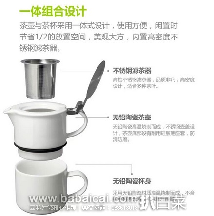 FORLIFE这个品牌来自美国,不过是个日本人创立,FORLIFE的陶瓷器具融合了东西方文化,在设计上具有艺术美感,最具代表性产品的就是这款FORLIFE 创意茶壶套装了。这款FORLIFE Tea for One with Infuser 14 ounces, Lime创意茶壶套装,分成上下两个结构,上面采用的是陶瓷茶壶内置不锈钢滤茶器,下方是babaicai.com一个容量414毫升的陶瓷茶杯,整体套在一起,用时分开,方便收纳又极具创意实用意义也很高,茶壶茶杯的釉色均是自己调制的配方,确保不含有害物质,FORLIFE的茶壶拥有两个特点,倒水时盖子不易脱落,壶嘴下方不易滴水.