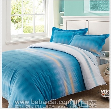 LOVO 安菲尔德 全棉贡缎四件套,全棉缎纹面料,采用活性印染工艺,手感柔软舒适。设计师利用简单的条格搭配清新优雅的蓝色渐变色,打造出梦幻的床品,置身其中,如一般清新的微风吹来,让疲惫的身心得以抚慰,慢慢沉静下来。