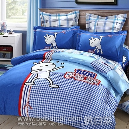 LOVO 兔斯基-酷玩 全棉斜纹印花四件套,全棉材质,蓝底,牛仔底纹搭配美式格子涂上,再加上酷酷的兔斯基妙趣横生的动作画面,使得此款四件套显得十分活泼生动,时尚有个性,让人心情快乐不少。整体配色很鲜亮。