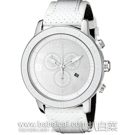 这款Citizen Unisex AT2200-04A Drive from Citizen Eco-Drive BRT 3.0西铁城中性款光动能腕表 ,表盘直径46mm,厚度12mm,使用专利Eco-Drive光动能机芯,带防过度充电功能,配备24小时、60分钟和秒表三眼计时小表盘,白色波点表盘彰显年轻活力,夜光指针、时标。 4点、5点之间日历窗口,不锈钢旋入式后盖,白色小牛皮表带,防水100米。