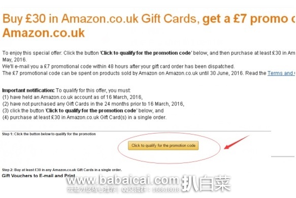 1.北京时间5月15日早8点前,点击页面黄色按钮““Click to qualify for the promotion code”,然后购买30英镑及以上的礼品卡(电子即可,永久有效),点这里购买30英镑电子礼品卡 | 可以参考美亚礼品卡购买充值活动(英亚基本相同)