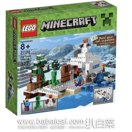 LEGO Minecraft 21120 the Snow Hideout Building Kit雪地藏身处积木套装,包含327块颗粒积木,包括史蒂夫、苦力怕、雪傀儡三个人仔,史蒂夫带有各种工具,雪傀儡能射出雪球。还可以和其他Minecraft系列组合