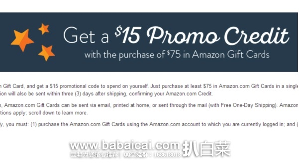 Amazon:白送近百元!部分客户买$75以上礼品卡送$15代金券,附参加活动步骤!