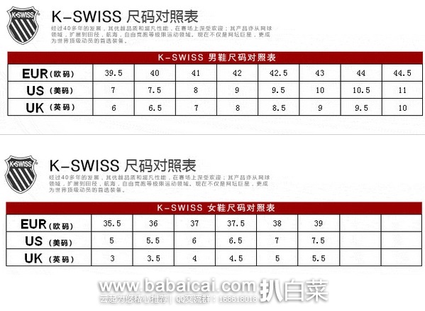 K-Swiss 盖世威 男鞋 女鞋 尺码对照表 uk英码对eu欧码参考