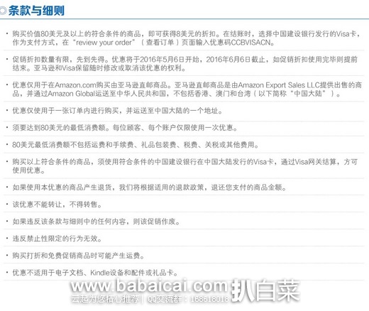 Amazon:建行VISA卡结账下单,直邮满$80立减$8 需用优惠码