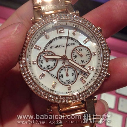 这Michael Kors的中型帕克计时的Glitz女士腕表,外观非常精美,可以搭配首饰一起配搭,相映成趣,三眼计时设计,很显大气,日本石英机芯,矿物水晶玻璃面不锈钢,表盘为珍珠贝母,不锈钢表带为优雅玫瑰金色。手表防水性能可达165米。带数字时间表/日历。