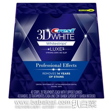 告别陈年牙渍,还你一个洁白的笑容。这款Crest 3D White Whitestrips Professional Effects - Teeth Whitening Kit 20 Treatments 牙贴可以提供专业级的牙齿美白效果。使用牙贴时仍然可以说话和喝水。牙贴会在牙齿上完全自然覆盖,剥落后干干净babaicai.com净无残留物。每天使用一次,每次30分钟。最好贴完再刷牙,效果更好,急速美白牙贴产品更可在1小时内快速实现牙齿美白!坚持使用牙齿会变白好几度。小编也在用,确实挺有效,偶尔会一点点牙酸,不要贴到牙龈就好,贴完后刷牙,牙齿会变白变光滑~