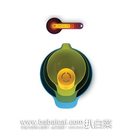 Joseph Joseph 12-Piece "The Brilliant Baker" Baking Gift Set 厨具12件套,从最小的蛋清分离器到三个大小不一的搅babaicai.com拌盆,再加上8个大小不一的量杯绝对是做糕点必备的申请。搅拌盆的边缘还贴心的设计了破蛋金属边。用的时候可以分开,收纳的时候又可以安装在一起,既美观有非常的实用省空间。