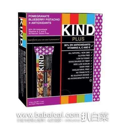 Kind 石榴蓝莓开心果抗氧化果棒12条 特价$10.7,S&S后$10.16,到手约¥105