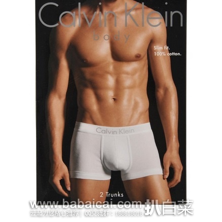 CK是美国知名服饰大牌,在全球服饰品牌价值排名10名出头。内衣是CK主打产品,当年CK濒临破产,就是靠内衣扭亏为盈翻身的。CK的内衣,特别是CK内裤,种类齐全价格合理,不论是基础款纯棉内裤、舒适的莫代尔内裤、亮骚的性感内裤、还是弹性好还速干的运动内裤,产品线超齐全,价格也比国内便宜N多。这款Calvin Klein Men's Body 2-Pack Trunk 男士修身短款平角内裤,采用经典平角款式设计,材质为100%棉,触感柔软舒适,另外这款平角内裤的颜色和剪裁都非常不错,相比普通剪裁更加性感。