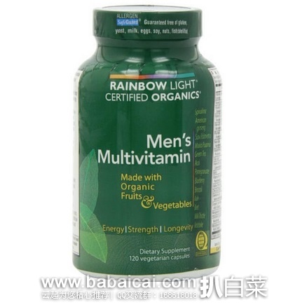 Rainbow Light(润泊莱)是美国著名保健品牌,所有保健品均通过USP、GMP、NNFA认证,以高纯度的配方和100%纯天然有机而闻名。Rainbow Light Organic Men's Multivitamin男性专用复合维生素,是润泊莱最高端的综合维生素产品,营养及功能最为全面,专为成年男性特别设计,亮点是采用从有机水果和蔬菜中提取的100%天然成分,并经过QAI有机认证。如螺旋藻、巴西莓、石榴、甜菜和羽衣甘蓝,以及西洋参、锯棕榈和绿茶等富含适应原的有机中草药,可作为膳食补充剂全面补babaicai.com充营养,再生、增强和保护人体的核心系统,以促进表现、活力和健康。富含有利于肝的植物成分,以及植物源生物活性酶和益生菌等成分,可以舒缓胃部,帮助吸收消化,不会引起胃部任何不适。