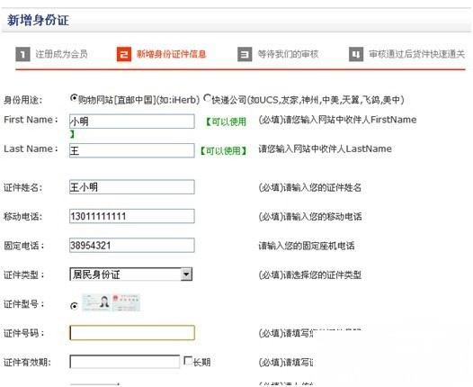 d.点击上图新增身份证,然后逐项填写,如下图。要注意的是First name和Last name要跟iherb上完全一致!