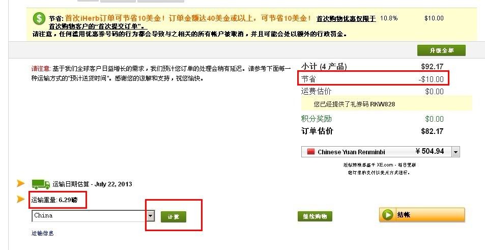 a.选好商品后,点购物车,核对重量是不是控制在7磅以内,可以正好7磅,优惠后总金额是否已控 制在80美元以内,可以正好(不算运费),核对是否有了新人优惠(满40减10,不满40则减5)如果购物金额满60,账号是登录状态,可以看到节省那一 项显示的金额应该大于10,因为满60打95折。(如果没有新人优惠,并且有要输入优惠码的地方,请输入RKW828),如果你还不确定是否新人优惠了,