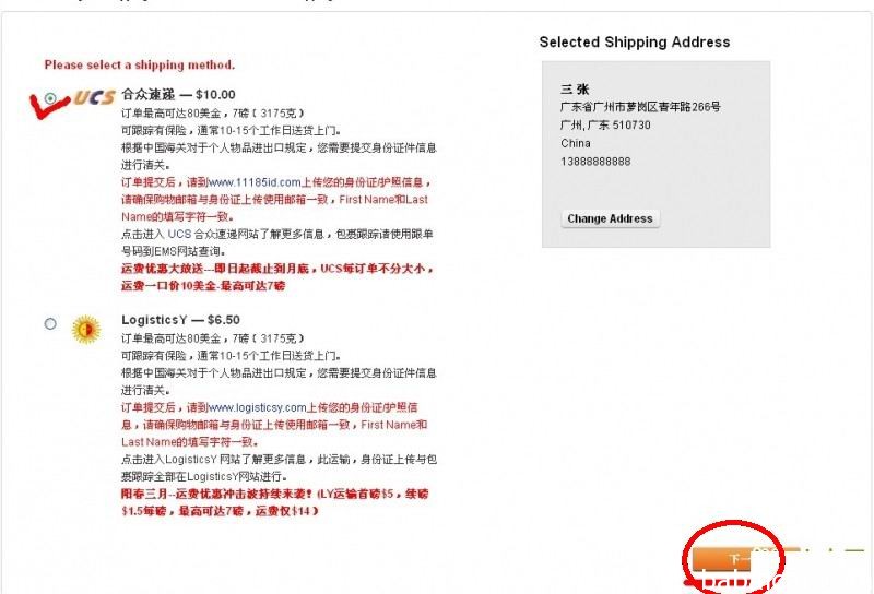 b.核对都没问题,国家选中国,选择一种运输方式,然后结账,进入下一步填写邮寄地址环节(目前直邮大陆运费优惠信息是折后满60 运费7磅4美元)