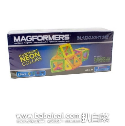 Magformers 磁力片,可以从平面到3D立体画,都是提拉成形,拼成形之后,容易拆分重组,玩起来非常有意思,可以让小孩子在玩乐中充分学习到数学几何知识。没有小颗 粒,容易收拾。另外Magformers磁力片孩子不玩还可用到生活中,可做成漂亮的冰箱贴,拼成收纳小盒,拼成花瓶,作家居装饰摆放。这款Magformers Neon Blacklight Set (28-pieces)霓虹磁力积木套装共28片,有三角形,正方形,色彩鲜艳,拼起来非常好看。