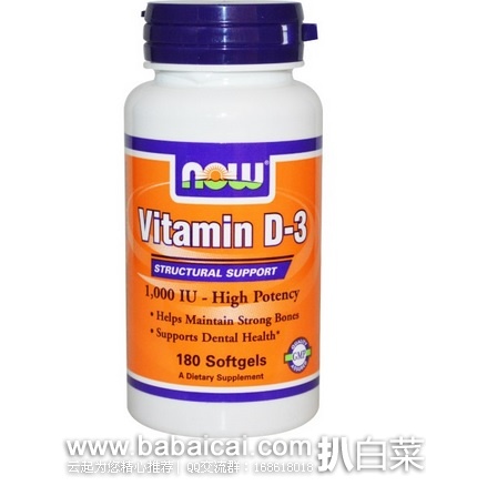 iHerb:Now Foods 维他命D软胶囊 180粒 今日限时特价$3,9折+直邮免运费,到手仅¥18