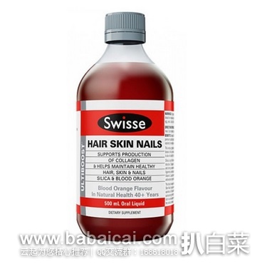 澳洲人的饮食都偏油腻,重油重盐,水质也不怎么样,很多人皮肤都很粗糙,还有着掉发的困扰。Swisse家非常火的明星产品 Hair Skin Nails胶原蛋白口服液可以有效的保护头发、皮肤、指甲。胶原蛋白是肌肤中的主要组成部分,人从18岁开始不断流失胶原蛋白,25岁时已经非常严重,所 以也有25岁是女人开始走下坡路的一道坎。Swisse Hair Skin Nails胶原蛋白口服液通过补充二氧化硅和VC参与促进身体自然生成胶原蛋白,纯植物精华,从血橙萃取精华中提取原料,抗氧化能力强大!