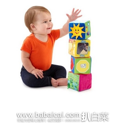 这组Baby Einstein Explore and Discover Soft Block Toys 很可爱的小积木,每个立方体的面上都不同颜色和分类的图案,可以教宝宝babaicai.com认知动物、水果、形状、颜色等。积木内附带响铃,响纸,小镜子,青蛙的脚板还可以拉动,非常有趣。