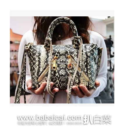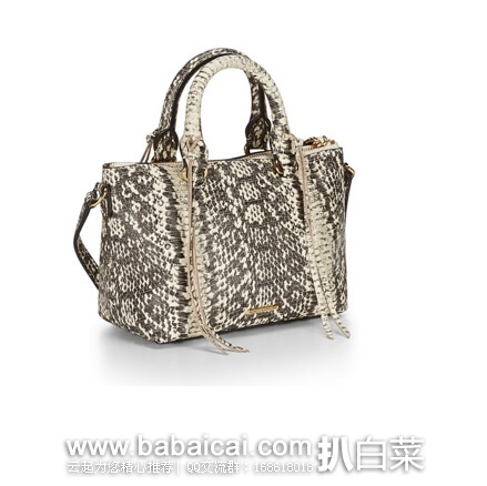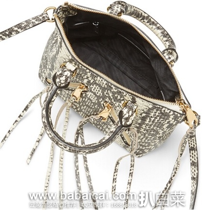 Rebecca Minkoff Micro-Moto Satchel Cross-Body Bag 瑞 贝卡明可弗单肩手提包,是2015年的新款,采用真皮材质,漂亮蛇纹印花,包前设计有2个拉链口袋,拉链头、手提带流苏装饰,设计感更强烈,更有朋克风, 充满与众不同的 个性,定制印花衬里,内部设计有一个拉链贴袋,两个插袋,尺寸为20*15*10厘米,零零碎碎的什么小玩意都够放了,而且是绝对提升气场与气质的必备包 款。