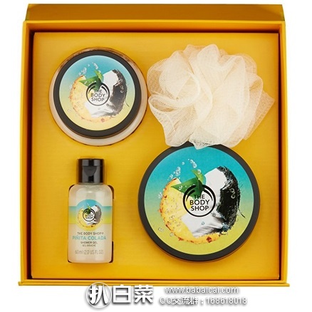 The Body Shop Pinita Colada Gift Essentials美体小铺蜜橘身体沐浴四件套,热带甜蜜菠萝椰子香味,礼盒大包装,送人自用都不错!包括滋润沐浴乳60ml,身体乳霜200ml,身体磨砂膏250ml以及沐浴球一个。