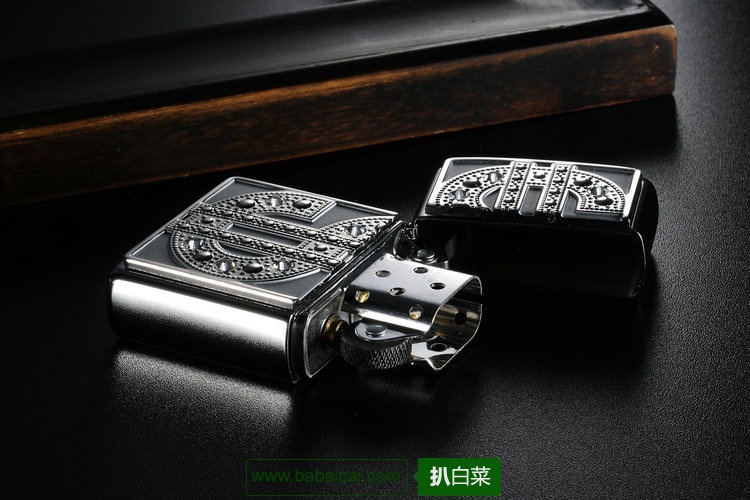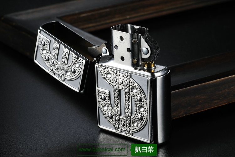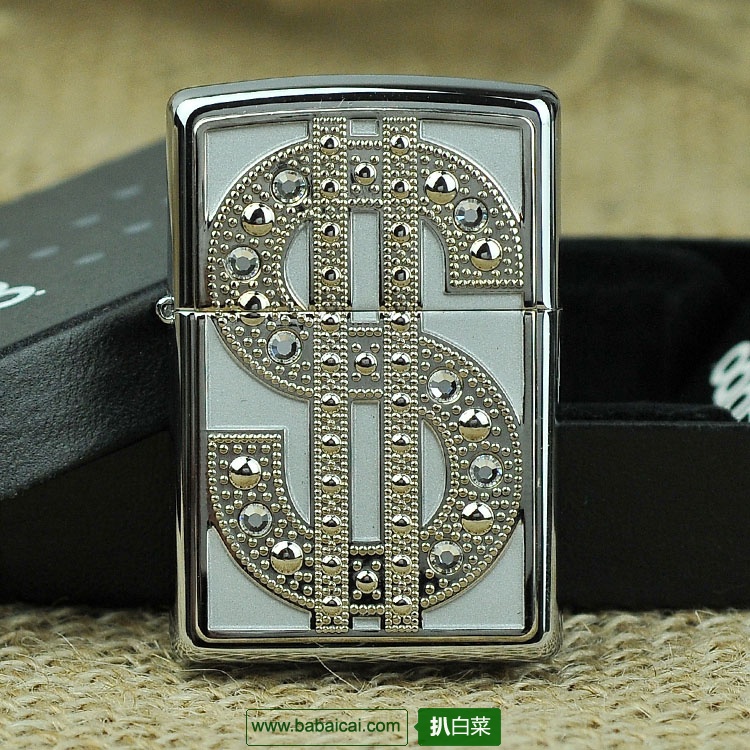 此款美国Zippo打火机采用全金属框架设计,坚固耐用,银色抛光表面处理手感极佳,火机正面图案为美元符号,土豪范十足,火机内超强防风打火槽结合清纯 的火机盒盖声彰显Zippo火机特色,可更换的火石和火芯使用更加持久,建议配合专用Zippo打火液效果最佳,美国制造。