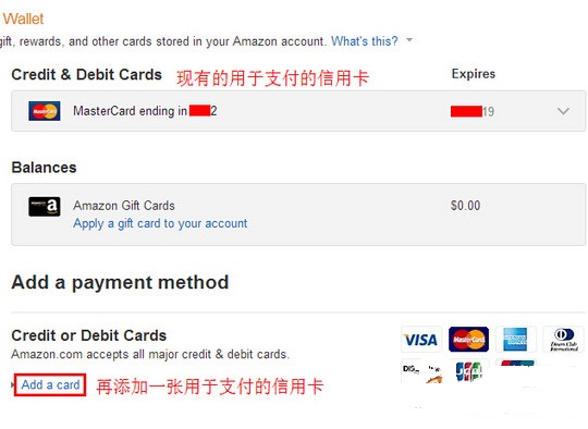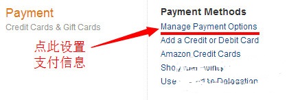 8.    另外,在“Your Account”你的账户的Payment一栏处,可以点击中间的“Manage Payment Options”进入Your Amazon Wallet页面,管理支付方式,可以在这里添加、删除信用卡,美亚也支持国内的银联信用卡。
