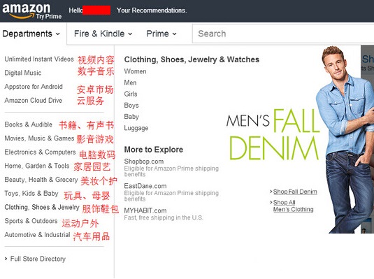 1.  了解商品分类及常见优惠信息回到美亚首页, 先看一下左上Departments美亚销售商品分类,最上面的四个分类都是美亚的在线内容服务,海淘大军关注更多的是下面的服饰鞋包、母婴、美妆个护、 电脑数码等类别,而这些商品也常有好价,时不时推出的各类优惠码也能带来更多实惠之选。而只要点击大类下面的子类名称就会进入专场页面,可以看到正在进行 中的促销活动。