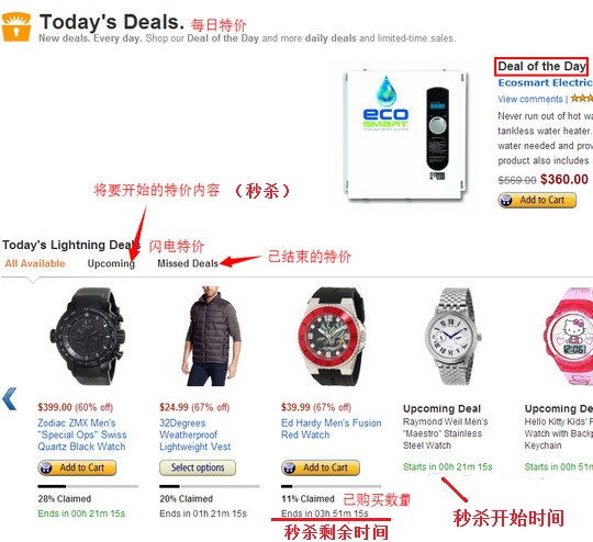 另外还有一个重要的促销板块,在页面顶部导航条左上角可以看到Todays Deals(也可以直接点此处进入),里面包含美亚的Deal of the Day每日金盒特价,以及Lightning Deals闪电秒杀特价,也就是国内常说的Z秒杀,前者特价都只持续一天,后者秒杀只持续几个小时,或者抢完提前结束,每日定时更新参加秒杀的产品。