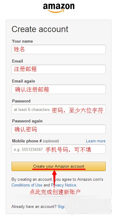 填写完成后点击下方的“Create your Amazon account”即可创建新账户。