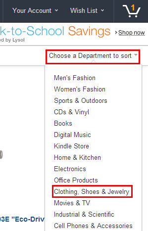 (2)此处以“CITIZEN”为关键词,一共搜索出几万条结果,首先我们在页面左侧选择商品分类,以排除不相干的的搜索结果:将鼠标悬停在页面右上角的“Choose a Department to sort”会自动出现商品分类列表,比如我们想找的是CITIZEN的腕表,那么就点击列表中的“Clothing,Shoes&Jewelry”服饰鞋包这一项,就会只显示这一分类下的CITIZEN相关产品,这里一下子就把搜索结果缩小到不到1200条;