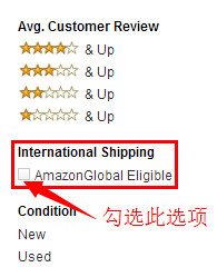 然后在“International Shipping”这一栏中勾选“AmazonGlobal Eligible”,这样就会筛选出可以国际直邮的商品,选择这两项之后,搜索结果中的商品就都支持直邮,并且都是美亚自营商品,这样就可以方便的选购可直邮商品了,下面我们再来看看商品详情页面。