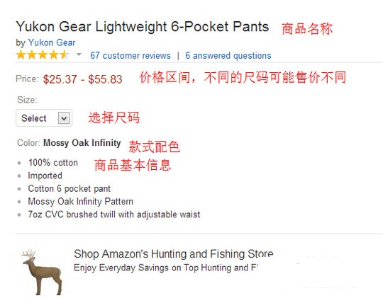 (1)找到我们要购买的商品之后,点击图片或者商品名称都会进入商品详情页面,这里以这款Yukon Gear猎装裤为例,商品详情页在的中间是商品的基本信息,包括名称、价格、规格等,如果有多种款式、或者尺码可选,也需要在这里选择。