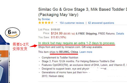 如下图所示,这款Abbott雅培Similac GO&GROW三段奶粉就需要一到两天配货。