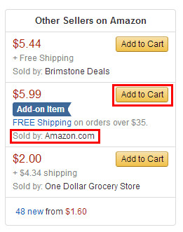 如果一件商品,美亚和第三方商家同时都出售,那么美亚会优先在商品页面显示价格更低的卖家,而如果我们还是想选择自营商品的话,可以在商品信息页面的右下侧进行选择,如下图所示,注明有“Sold by:Amazon.com”这一栏的价格就是美亚自营售价了,点击旁边的“Add to Cart”就可以将自营商品加入购物车