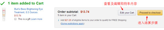 (2)加入购物车后会自动进入提示页面,这里我们可以看到购买的商品信息,点击灰色的“Edit your Cart”可以进入购物车页面,进行修改购买数量、删除商品等操作;也可以点击“Proceed to checkout”进入结算步骤: