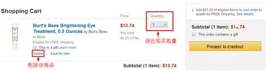 (3)购物车页面,点击“Delete”可以将商品从购物车中移除;在“Quantity”一栏修改购买数量,这里需要注意,购买数量不能超过商品库存 数,如果这款眼霜目前只有9件库存,那么最多可以购买9件,选择更多就无法进行结算了;确认购买数量后,点击右侧的“Proceed to checkout”开始结算。