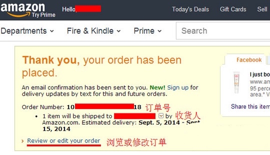 1.   成功下单后会自动转入订单信息页面,在这里会显示订单号和收货人信息,而且可以在这里点击“Review or edit your order”进行浏览或者修改订单的操作。