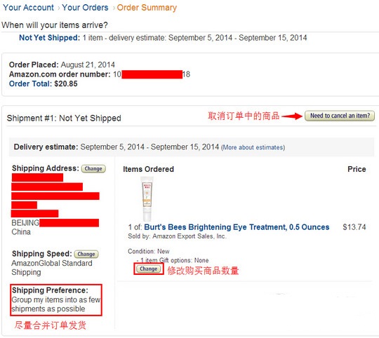 另外也可以修改购买数量,如下图,点击商品信息下方的“Change”,当然,如果需要修改或者取消,需要在订单发货之前进行.