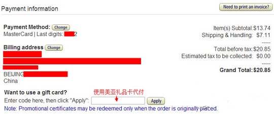 3.   在订单概览页面下方还可以使用美亚礼品卡支付,由于在正式发货的时候才会从支付信用卡中扣款,所以,在发货才可以使用美亚礼品卡抵扣部分或全部订单金额,如下图所示,输入Gift Card礼品卡号码,然后点击右侧的“Apply”即可。