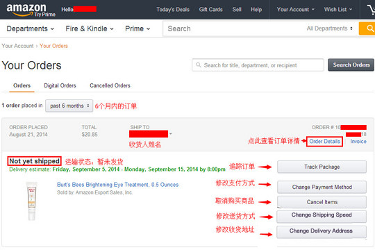 6.   点击“Your Orders”之后会进入订单管理页面,可以看到近期订单和发货状态,比如此处订单显示“Not yet shipped”表示尚未发货;发货之后,我们可以点击右侧的“Track Package”追踪订单物流信息;并且在发货前,还可以修改支付信息、订单内容和收货地址等信息。