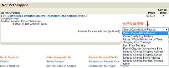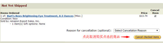 7.   美亚的订单取消过程十分友好方便,在上一步的订单管理页面中点击右侧的“Cancel Items”就可以对订单内容修改或者删除,当然必须在发货之前进行才可以;点击之后,会进入订单修改页面,我们需要先在右侧Cancel Item一栏勾选需要取消的商品,然后选择取消原因,然后点击下方的“Cancel checked items”即可。