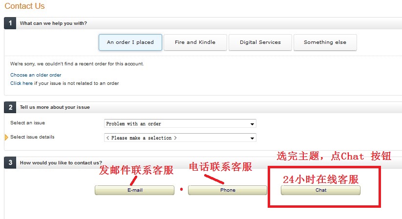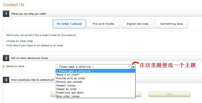 3.   在这里我们需要选择求助类型,主要分为四大类,随便选一个和你要咨询的问题接近的主题就行,然后 would you like to contact us”最右边出现“Chat”在线客服按钮,点击即可。
