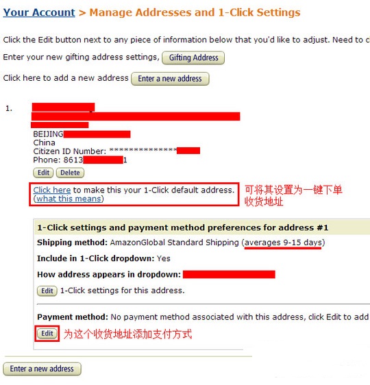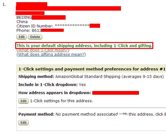 另外,点击上图红框中的“Click here”可以将这个地址设置为default address默认收货地址和1-Click一键下单的收货地址,让购物过程更加简便,点击后,会出现下图红框中的文字,显示这个地址已经被设置为默认收货地址。这里我们还可以看到,1-Click一键下单的Shipping method送货方式是AmazonGlobal Standard Shipping亚马逊国际标准快递,是耗时较长的一种,正式发货后大约需要9到15日才能送达(最近似乎改成了18-32天了?),当然也是运费最少的送货方式,这个在结算的时候还可以再更改。