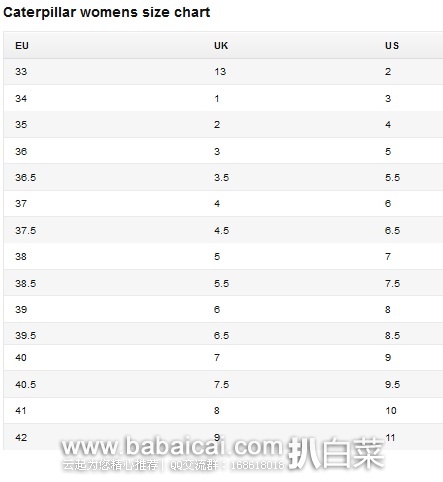 Caterpillar卡特彼勒女鞋尺码表 uk英码对eu欧码参考