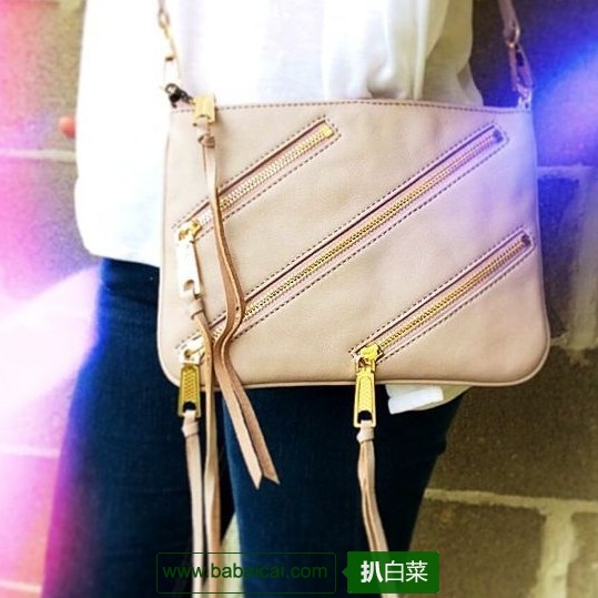 三斜拉链款历史新低了。Rebecca Minkoff Moto Rocker Cross-Body Handbag瑞贝卡明可夫女士真皮斜挎包,全真皮面料,带有Rebecca特色的多拉链口袋设计,包前斜角设计有3拉链口袋,拉链头带流苏装饰,包背部 设计有一个金属铭牌,顶端拉链开口,内部有两个插袋和一个拉链口袋,可拆卸肩带,除了斜跨,也可作为包中包或者手包使用,外形尺寸约为24 *17 *5cm。