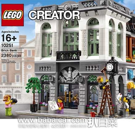 这款LEGO Creator Expert Brick Bank Building Kit (2380 Piece)乐高积木银行,属于大热收藏级的街景系列,货号为10251,2016年发售的新品,10251共有2380片颗粒,包含5个人仔(银行经理、秘书、出纳及一个母亲和孩子),成品尺寸长宽高为25厘米 X 25厘米 X 26厘米,上下两层转角结构。这也是街景系列继10182街角咖啡店、10211百货公司及10232皇宫电影院后的第四款转角建筑,延续了街景系列三年一转角的传统。
